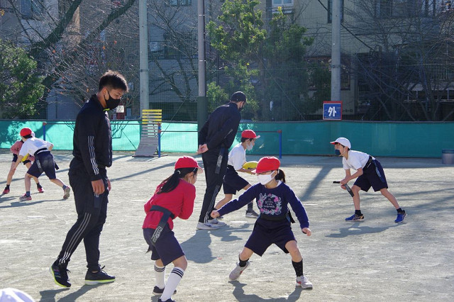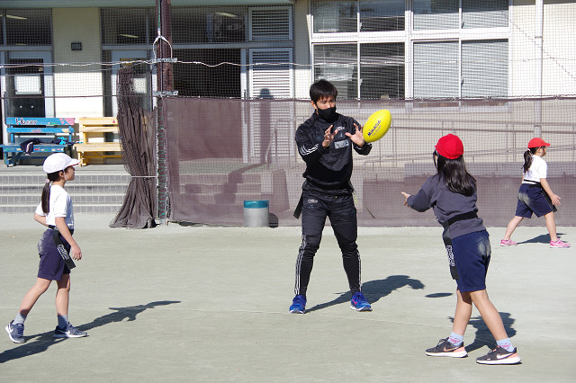 2人1組に分かれタグ取りとパスの練習を実施しました。転がったボールや高く飛ばしたボールなど、いろいろなボールをキャッチするトレーニングも行いました。1対1のアタック、ディフェンスでは、アタックはトライを狙う際、ディフェンスにタグを取られないように、細かく左右に動く工夫をしながら走っていました。