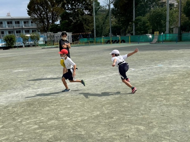各学校では、最初に選手から簡単なタグの取り方や、ボールの持ち方とパスの投げ方の説明を行いました。その後に、練習を行うと児童たちは、すぐに上手に出来るようになっていました。最後にコートを使った1対1の試合を体験してもらいました。当日は天気も良く、水飲み休憩を入れながら、元気いっぱいに、タグラグビー体験を楽しんでくれていました。