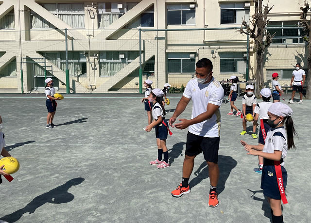 10月に世田谷区の小学校「中丸小学校、深沢小学校、太子堂小学校、烏山小学校」の4校へ訪問し、ゲストティーチャーの活動として、タグラグビーの指導を行いました。
