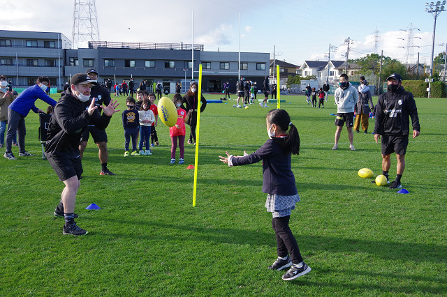 今回はリコーグラウンド周辺地域である喜多見地区管内の小学校を対象に募集・抽選を行い、35組/約107名のご家族を招待してラグビー体験や防災体験を実施しました。