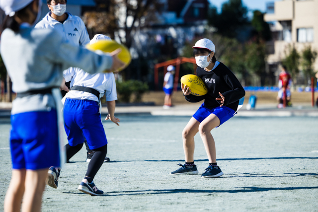 12月は世田谷区の「山野小学校、桜木中学校」の2校へ訪問し、ゲストティーチャーの活動として「タグラグビー」の指導を行いました。