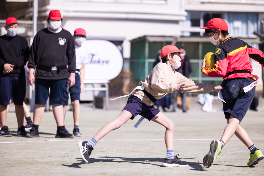 2月は世田谷区の玉堤小学校へ訪問し、ゲストティーチャー活動として「タグラグビー」の指導を行いました。