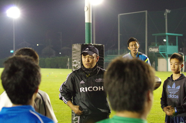 今日はリコーブラックラムズのBKコーチの武川さんがパスとキックをレクチャーしました。