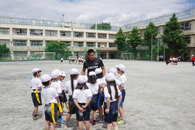 6月12日(月)世田谷区立経堂小学校のゲストティーチャーとして、辻井選手・濱野選手とラグビー部スタッフが3年生4クラス122名の生徒さんにタグラグビー指導を行いました。