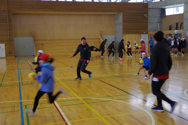 タグラグビー用のボールを使いパスやキャッチの練習、競争を行い、ハイボールキャッチや選手との1対1にも挑戦してもらいました。