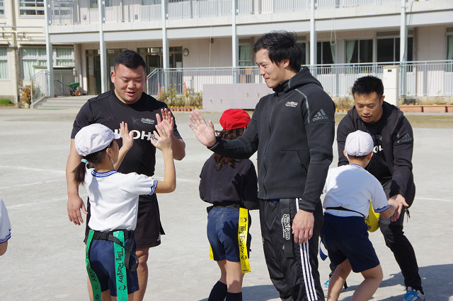 2月15日世田谷区立赤堤小学校のゲストティーチャーとして、ブラックラムズの選手達が3年生3クラス106名の生徒さまにタグラグビー指導を行いました。