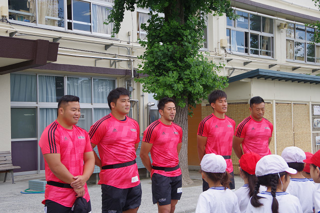 6月27日(水)世田谷区立経堂小学校のゲストティーチャーとして、渡邊選手・小池選手・深津選手・高橋選手・大西選手5名とラグビー部スタッフが3年生4クラスの児童さんにタグラグビー指導を行いました。