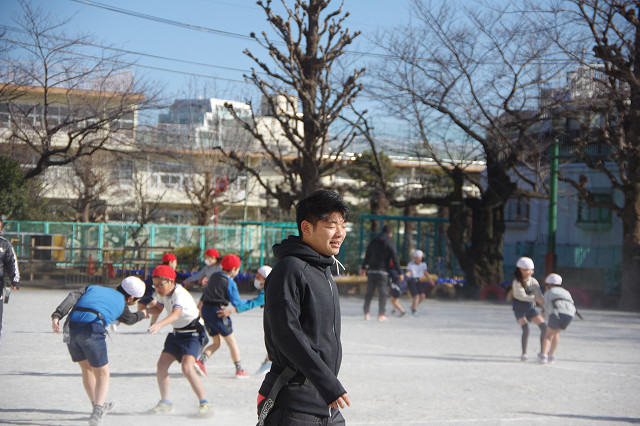 1月24日(木)東調布第一小学校のラグビー普及活動として、森選手・中村選手・浜岸選手の3名とラグビー部スタッフが4年生3クラスの児童105名を対象にタグラグビー指導を行いました。