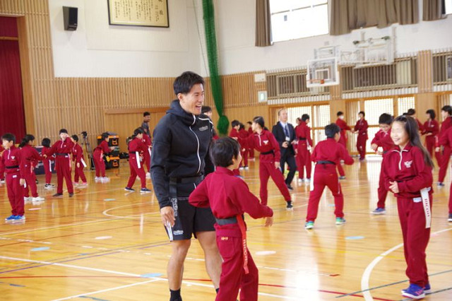 ラグビーワールドカップをテレビで観た児童たちは、初めて触るボールの感触に驚きながらも、選手たちが教えるパスの方法をしっかりと聞き、練習を行っていました。夢先生授業では濱野選手がラグビーを始めた5歳の頃の話から、ブラックラムズに入団して現在に至るまでに学んだ、「目標を立てて、それに向かって努力すること」、「仲間を大切にすること」を児童たちに伝えておりました。