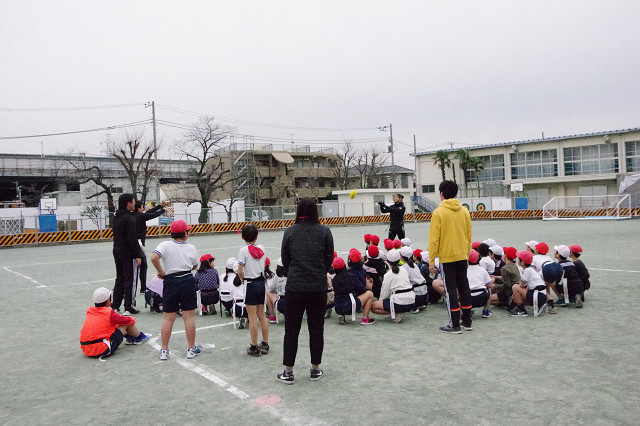 1月27日(月)世田谷区喜多見小学校のゲストティーチャーとして、小松選手・福本選手・髙橋選手の3名とラグビー部スタッフが5年生4クラスの児童123名を対象にタグラグビー指導を行いました。