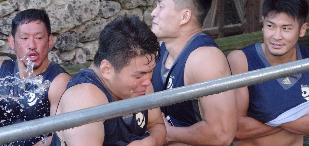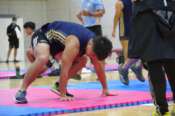 朝食、ミーティングを経て、メイングラウンドでのラグビートレーニングを開始。ウォーミングアップ、スピードトレーニングを行ったあとはブレイクダウンドリル。