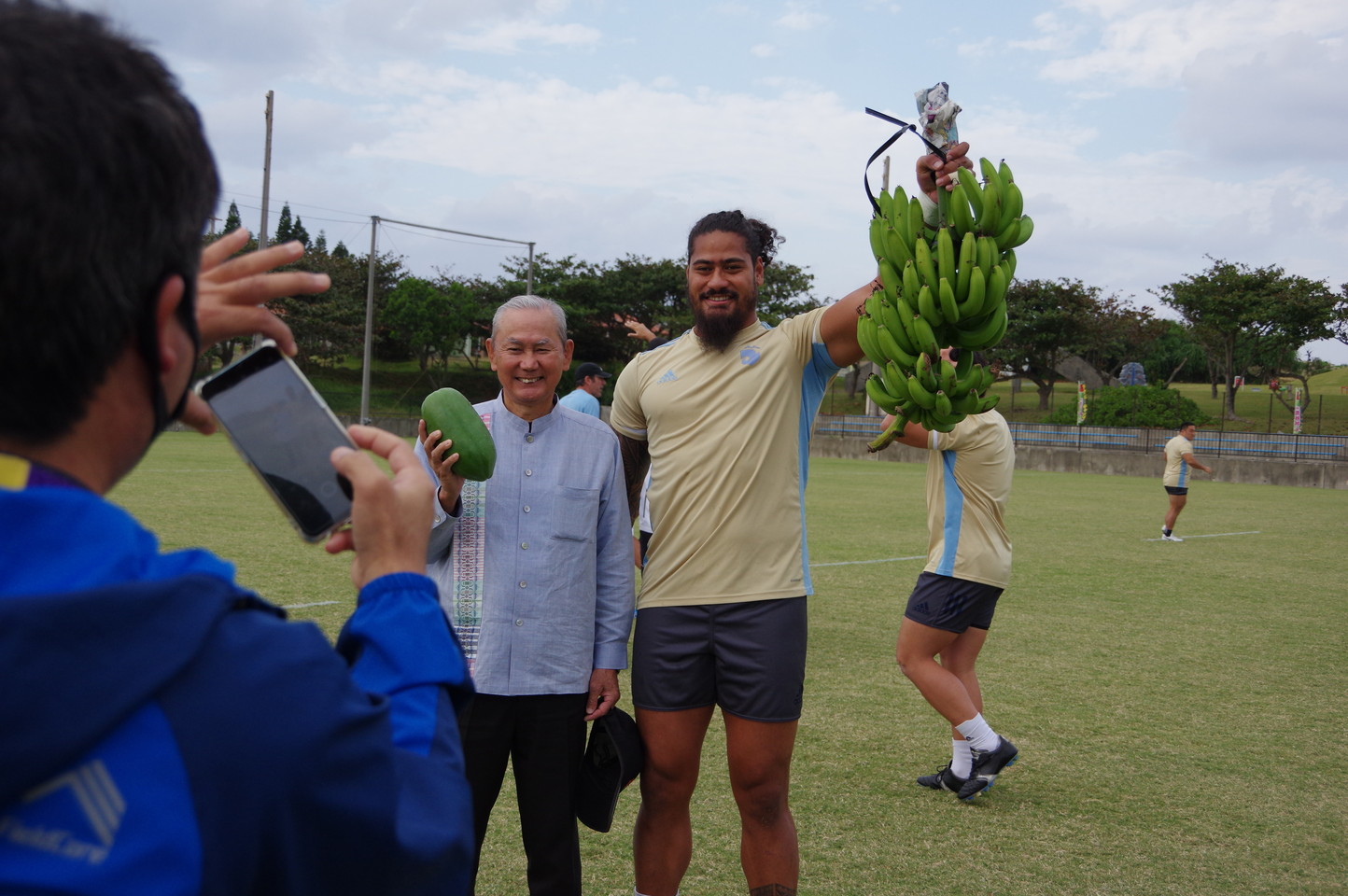 午後の練習の前に、読谷村の石嶺 傳實(いしみね でんじつ)村長、商工観光課の皆さま、ミス沖縄の方々に歓迎の花束や贈呈品をいただきました。