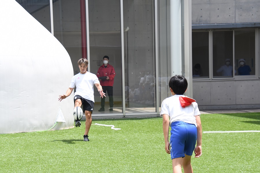 ラグビー体験会では、選手ともに身体を動かした後、グループにわかれてのボールリレーや、選手のパスやハイパントキックキャッチ体験をおこないました。初めてラグビーボールを触れるお子さんも多い中、元気な笑顔があふれる時間となりました。