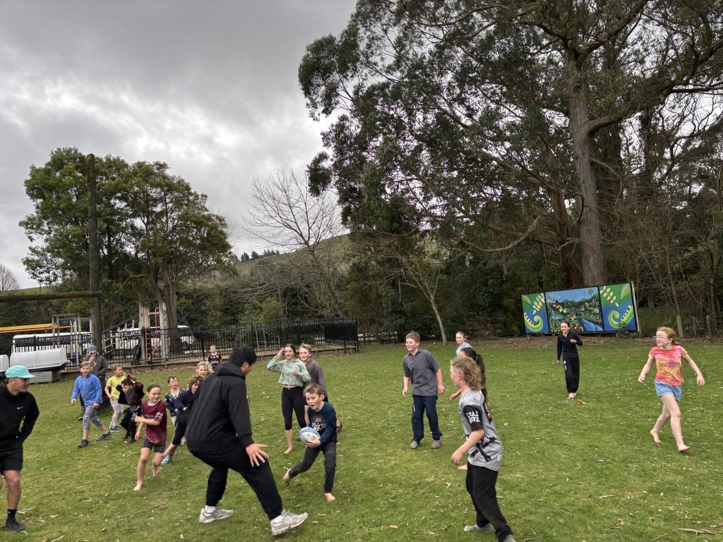 その後、子どもたちが登校して来て、ラグビーボールを使って遊んでいたので一緒にラグビーをしました。