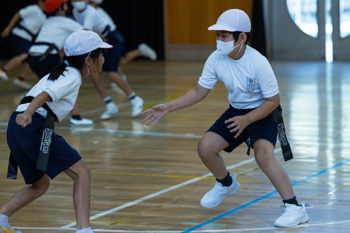 今回は、タグを取り合ったりパスの練習から最後に1対1になってのゲームを行った学校もあれば、ボールの受け渡しの練習に多くの時間をとってから1対1になってのゲームを行った学校もあったりと、プログラムに変化を入れての指導を行いました。