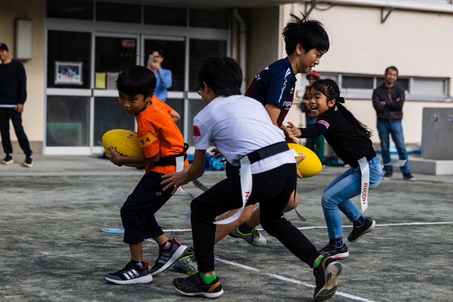 それができたところで、6人で1チームになっていよいよタグラグビーゲーム!最初は戸惑っていた子供たちも、次第にラグビーらしい陣形が作れるようになっていきました。