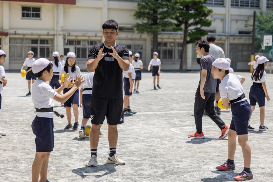 6月は、世田谷区の「池ノ上小学校、用賀小学校、八幡小学校、奥沢小学校、経堂小学校」の5校へ訪問し、ゲストティーチャー活動として「タグラグビー」の指導を行いました。