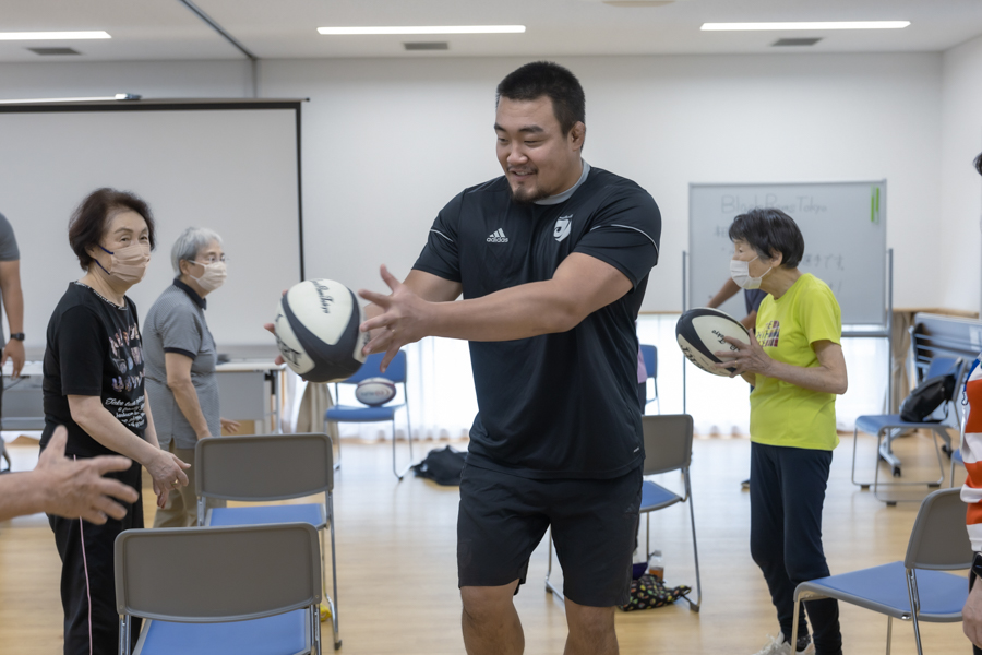 それぞれの講座では、まずブラックラムズ東京のスタッフや選手がコーチ役となって、ラグビーボールを使って楽しみながら体を動かしてもらい、その後にスポーツ振興財団のトレーナー指導による筋力アップ体操を行いました。そして最後は参加者から選手に質問をもらったりして交流を図り、私たちの活動やラグビーに興味を持ってもらいました。