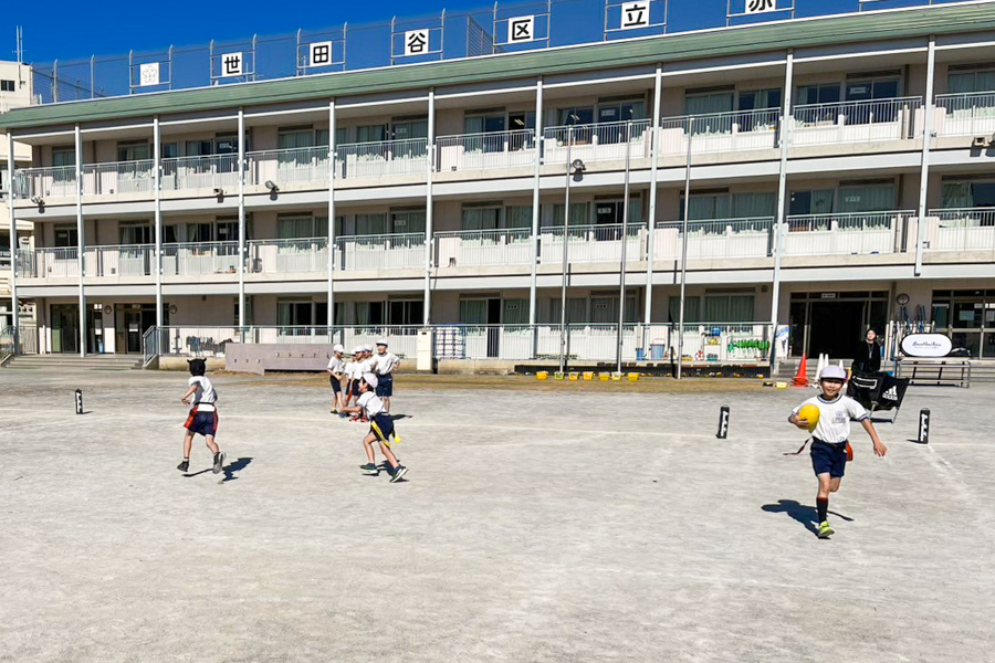 1月は、世田谷区の「松沢小学校(2回)、芦花小学校、世田谷小学校、桜丘小学校、代田小学校、下北沢小学校、東深沢小学校、赤堤小学校」と狛江市の「狛江第三小学校」、計9校を訪問し、タグラグビーの指導を行うことができました。