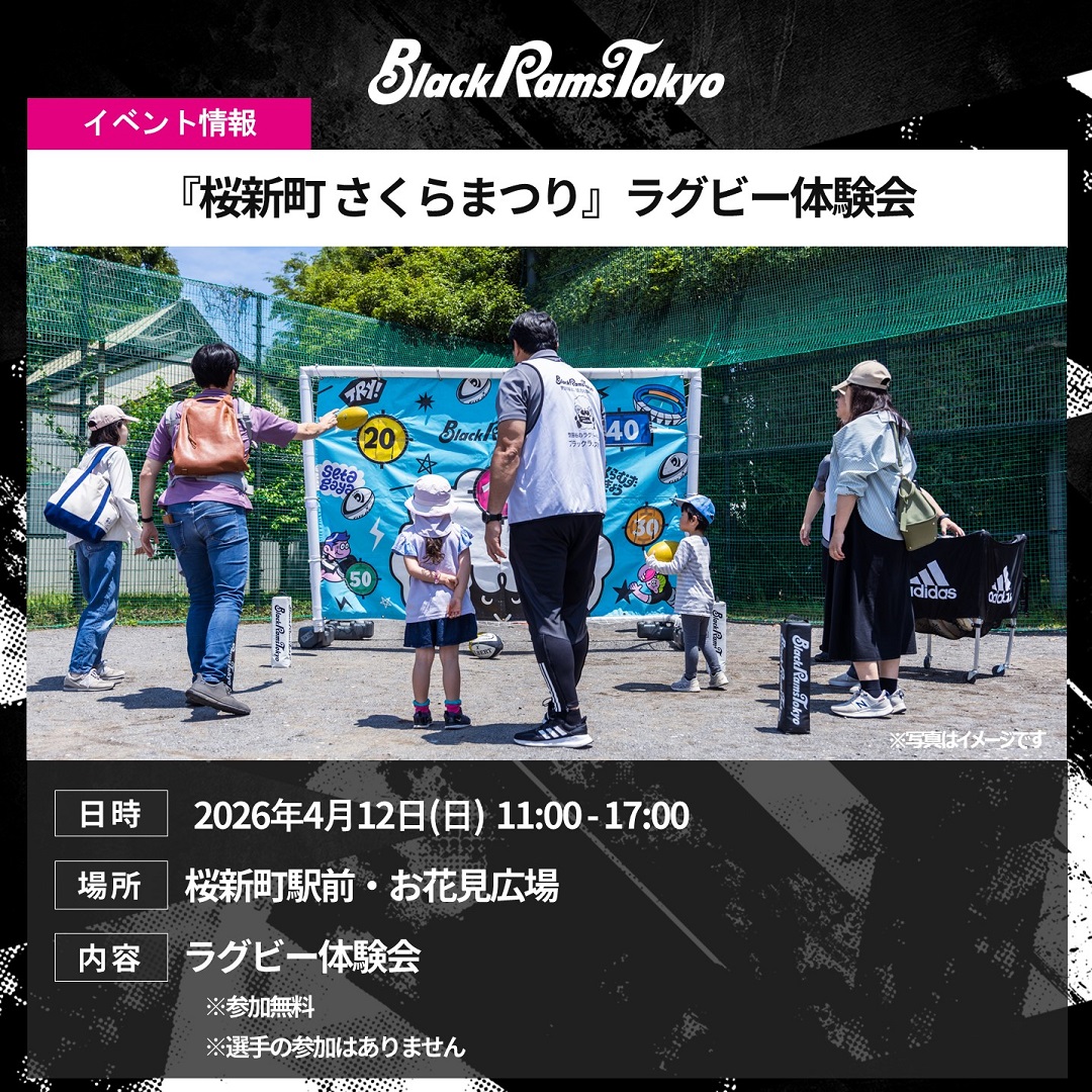 2026年4月12日(日)に「桜新町 さくらまつり」への参加をお知らせします。当日はスタッフによるラグビー体験会を実施します。みなさまぜひお越しください。
